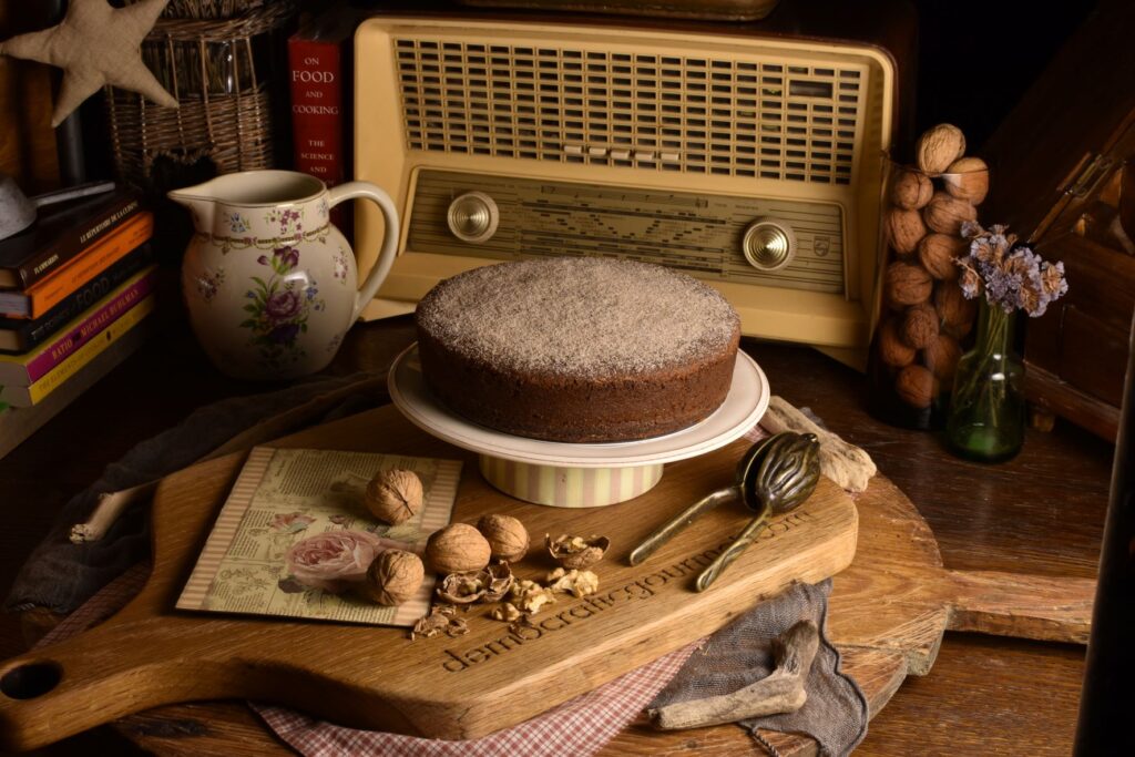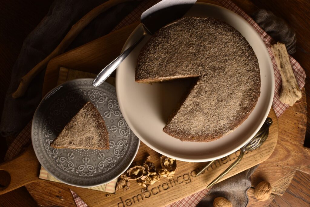 We remove the cake from the oven and after 5-10 minutes we unmold it and we immediately wrap it well with cling film in order to retain its moisture and softness. We let it cool completely, as it is wrapped. Once the cake has cooled completely, we generously sprinkle it with superfine or icing sugar, mixed with a little ground cinnamon.