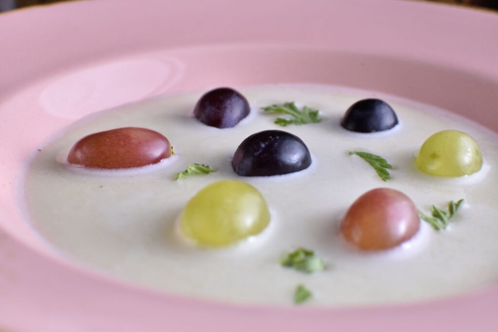 Σερβίρουμε την ajoblanco, διακοσμώντας με ρώγες σταφύλι και κομμένα φύλλα αρμπαρόριζας.