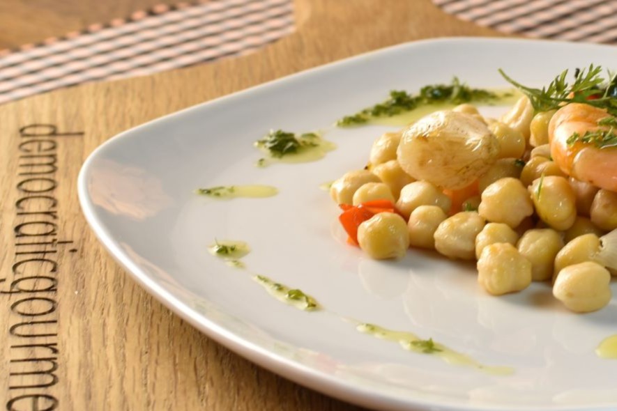 Μείωσα το ζωμό και έβαλα τη "σάλτσα" σε ένα τηγάνι με λίγο ελαιόλαδο, τα ρεβίθια, τα κρεμμύδια και τις πιπεριές και τα σοτάρισα για 1-2 λεπτά.