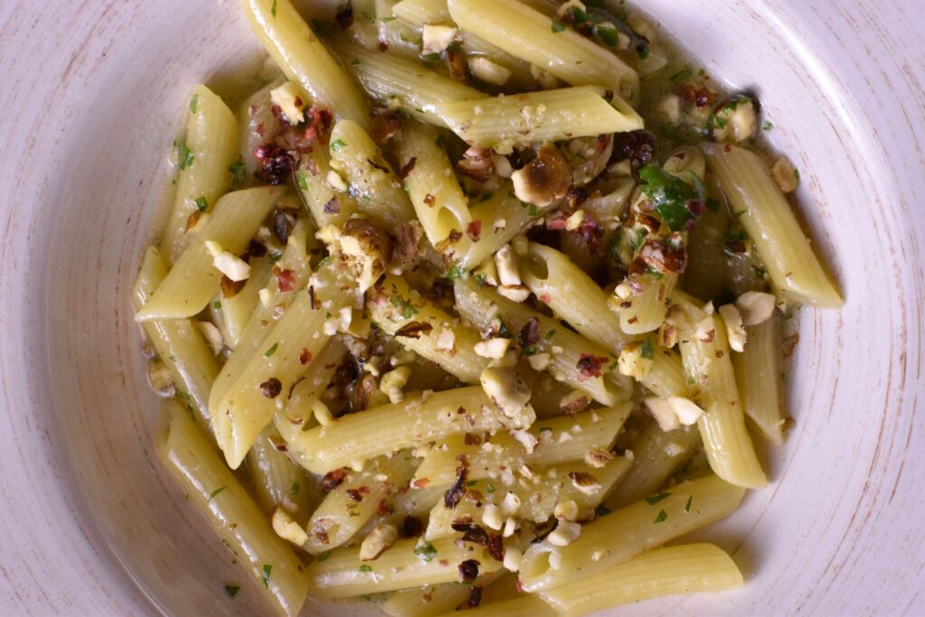 Όταν το σκόρδο αρχίζει να γίνεται χλωμό προς μπεζ προσθέτουμε δύο κουτάλες πολύ ζεστό και ελαφρώς αλατισμένο νερό (σε αυτή την πάστα μάλλον δεν πολυπάει ο ζωμός) και στη συνέχεια τις πένες και συνεχίζουμε το μαγείρεμα των ζυμαρικών μέχρι το σημείο al dente, προσθέτοντας πολύ ζεστό νερό, όταν χρειάζεται, και ανακατεύοντας συχνά. Όπως στο ριζότο. Είναι πολύ βασικό να μην αφήσετε τα ζυμαρικά να στεγνώσουν και να προσθέτετε βραστό νερό, πριν στεγνώσουν, προκειμένου να διατηρηθούν τα άμυλα των ζυμαρικών.