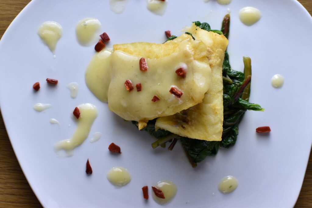 Όταν δούμε για πρώτη φορά κάποιες φυσαλίδες να ανεβαίνουν από τον πάτο του τηγανιού, αρχίζουμε να κινούμε συνεχώς το τηγάνι για να αναμείξουμε τις εξερχόμενες πρωτεΐνες του δέρματος με το λάδι. Μετά από 2-3 λεπτά αφαιρούμε τα φιλέτα και με ένα σύρμα αρχίζουμε να ανακατεύουμε το υγρό προκειμένου να δημιουργηθεί μια λευκή χοντρή σάλτσα. Ελέγχουμε το αλάτι της σάλτσας.