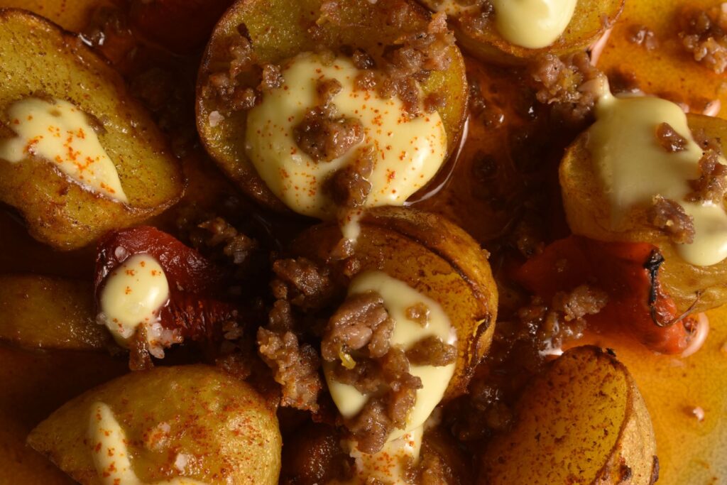 β) Προσθέτω επίσης μια μικρή ποσότητα από σπασμένο χοιρινό λουκάνικο πάνω από τις πατάτες και τη σάλτσα αλλιόλι πολλαπλασιάζοντας έτσι το ουμάμι τους.