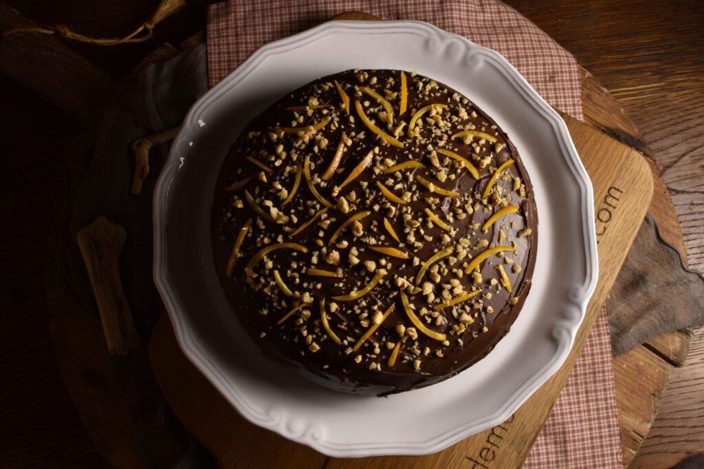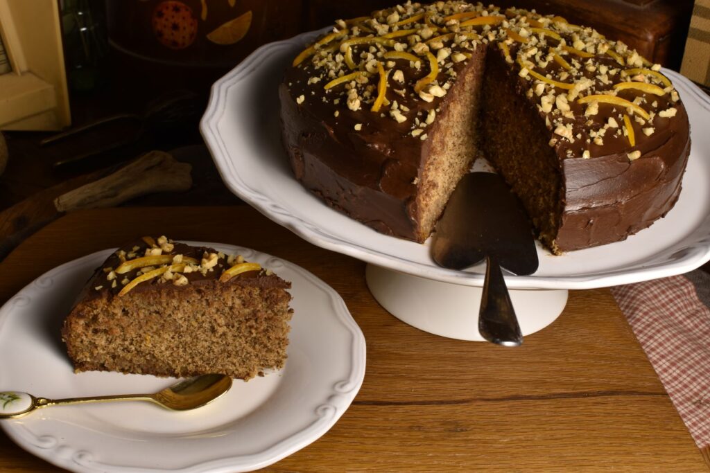 We cover the cake with the ganache and we garnish with thinly sliced candied orange peels and coarsely chopped walnuts.