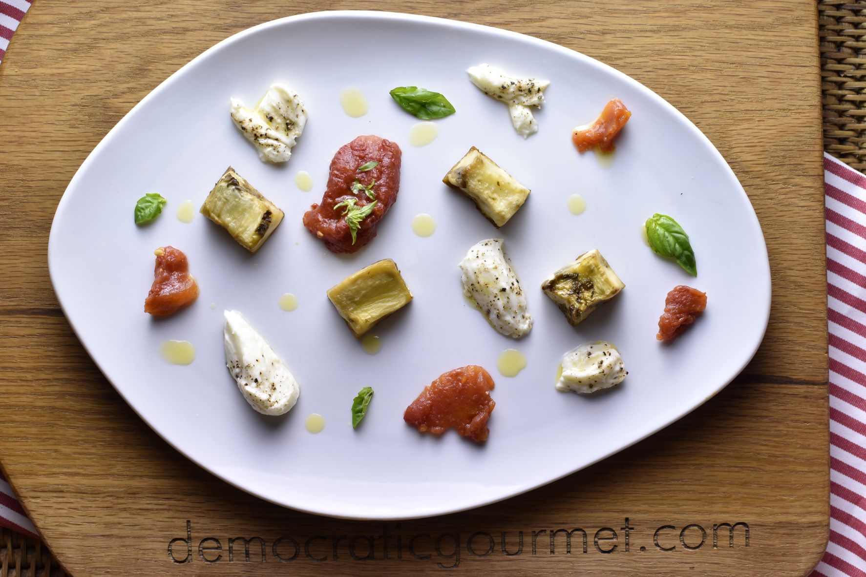 Having already roasted tomatoes and eggplants in my fridge, all that I needed to do was cut them in pieces and reheat them.