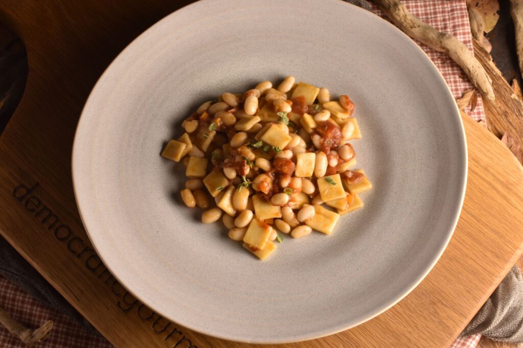 We add them in the sauce along with the beans and the soffrito, we garnish with fresh oregano leaves and some more olive oil and we serve.