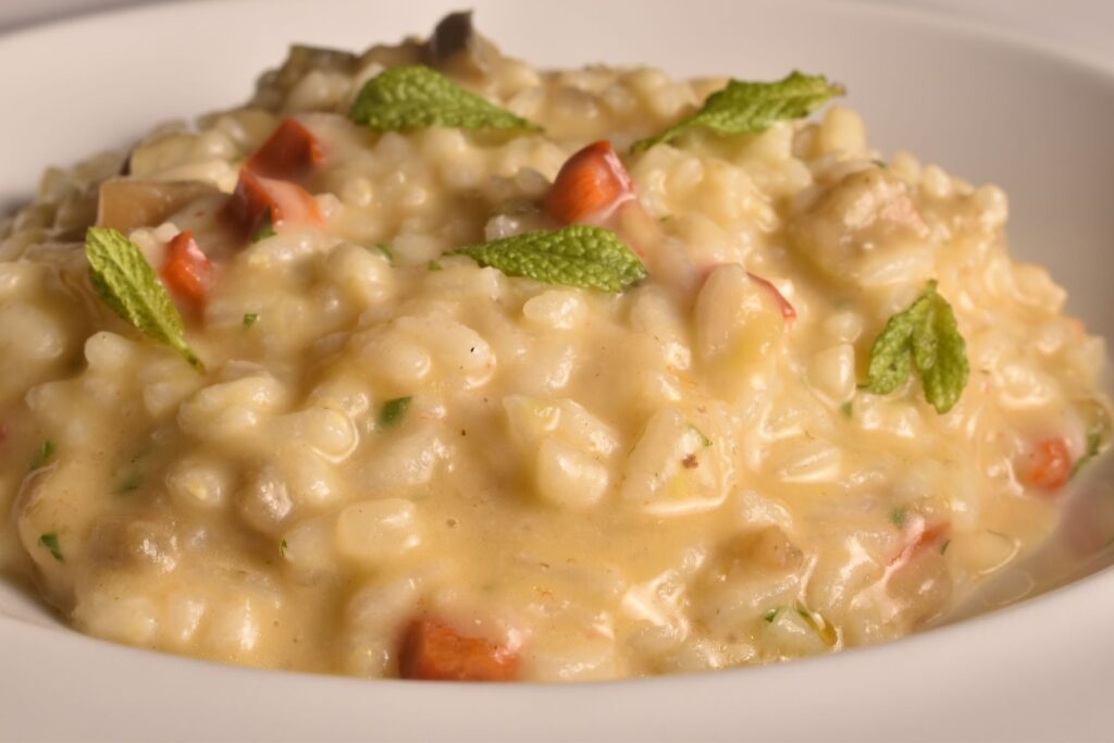 Stirring continuously we start adding the butter, the cheese, the chopped mint and the dice of vegetables. We continue stirring until we obtain a very creamy result, we cover the pan with a lid and we let it stand for 2-3 minutes.