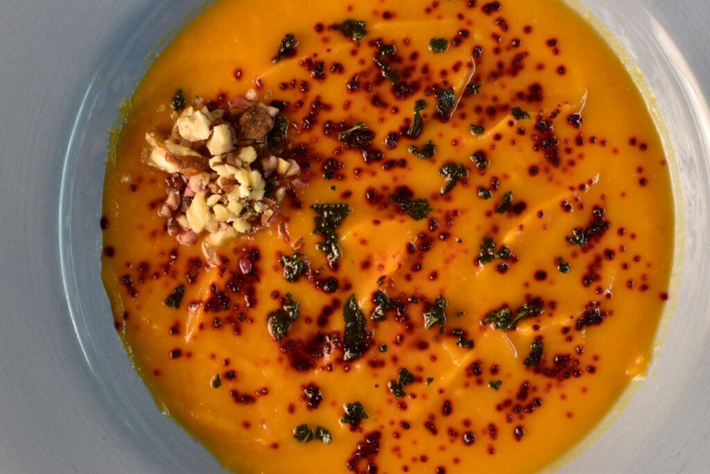 We plate the soup, putting over some sage leaves, walnuts and beetroot powder.