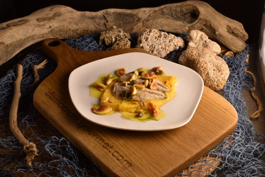 We put some purée in a plate and we add fish, figs, capers and peanuts. We drizzle more oil, we garnish with rosemary leaves and we serve.