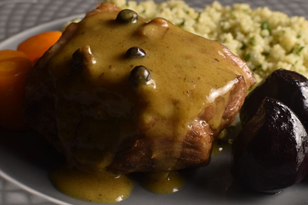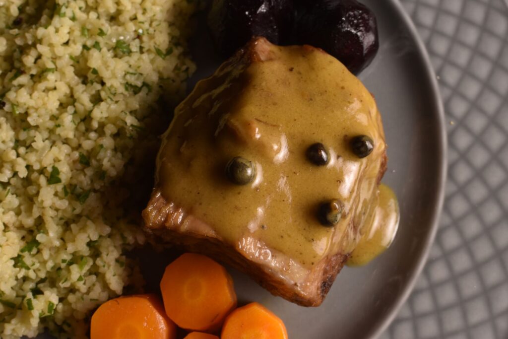 We collect the juices from the pan and we add them in a skillet. If they are too concentrated we dilute them with water or stock and we deglaze. We add the crushed juniper berries, we bring to medium-high heat and we start reducing its volume. When the sauce is thick enough we add the mustard and the zest. We check the saltiness and we keep aside.