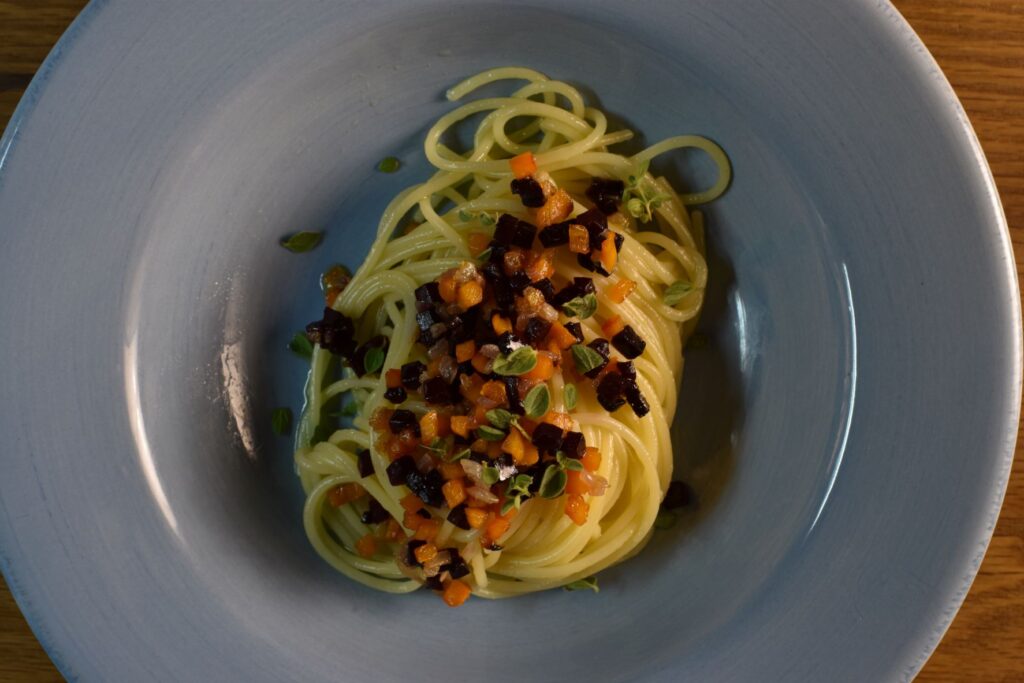This dish, as all brunoise pastas, can be prepared during the time needed for a pasta to boil.